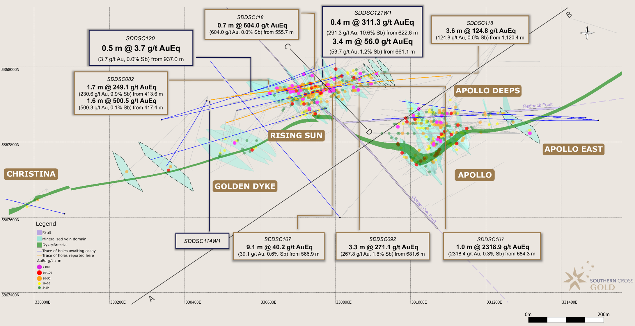 “Intersecting mineralisation 450 m down dip below Golden Dyke in a parallel structure speaks to the multiple opportunities to extend the volume of mineralisation down dip. Although moderate grade, this very large step shows, for the first time, the mineral system continuing 450 m below the main historic mines on the project. It also leads to further opportunities to multiple “golden ladder” host structures. Further drilling is of course required to demonstrate how the system will develop in these areas, which SXG are already undertaking. Given the success of the system getting better at depth in the adjacent Rising Sun and Apollo areas, we have high expectations.